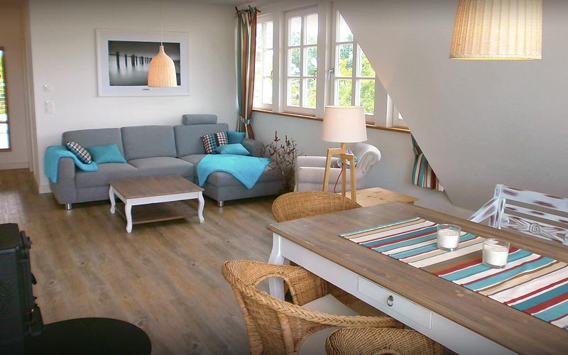 Ferienwohnung Nixe befindet sich im Dachgeschoss. Große Dachgauben sorgen für genug Platz und Licht im Inneren. Die Wohnung erreichen Sie über eine Außentreppe, an die sich auch die Loggia anschließt. Hier finden Sie auch einen Tisch und genügend Stühle, um die frische Luft zu genießen.
