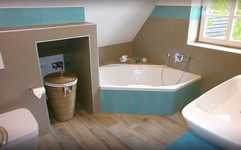 Im geräumigen Badezimmer finden Sie eine großzügige Dusche, eine Eckbadewanne, einen Waschtisch sowie eine Toilette. Die Sauna lädt zur Entspannung ein. Beim Einschalten des Lichts ertönt automatisch das integrierte Radio.